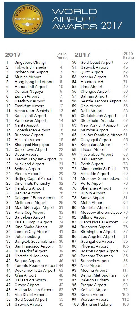 Para muitos, é apenas uma curiosidade. Mas, para outros, pode ser muito útil. A consultoria britânica Sky Trax promove anualmente uma premiação para os melhores aeroportos do mundo. O ranking se baseia numa pesquisa com mais de 14 milhões usuários do mundo todo.