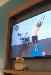 Na televisão, nada menos que 18 canais próprios do hotel exibem aulas 24 horas por dia. Tem alongamento, yoga, musculação, exercícios aeróbicos… A meticulosidade foi tanta na criação dos ambientes que até uma lousa com pincéis atômicos existe no quarto para você poder anotar sua programação fitness ou as dicas que vê na TV.