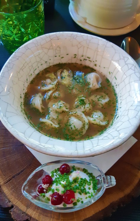 Eu iniciei com o pelmeni, uma espécie de “capelletti russo”, que pode ser servido de várias formas (veja este post em que eu preparo o pelmeni durante uma aula de culinária em Moscou).