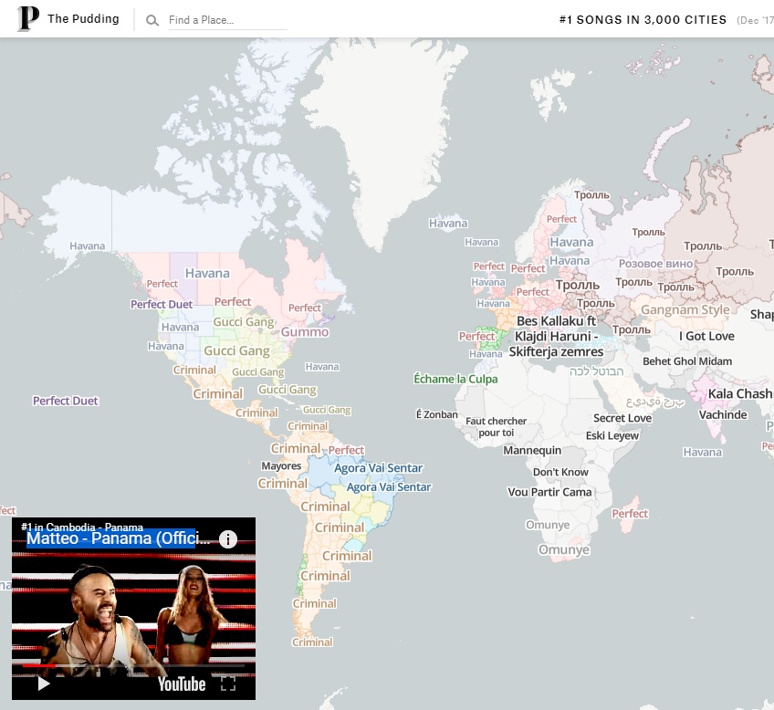 Pois bem, o site de divulgação cultural americano The Pudding criou uma página que mostra qual a música mais tocada no Youtube em cada lugar do mundo, em tempo real.