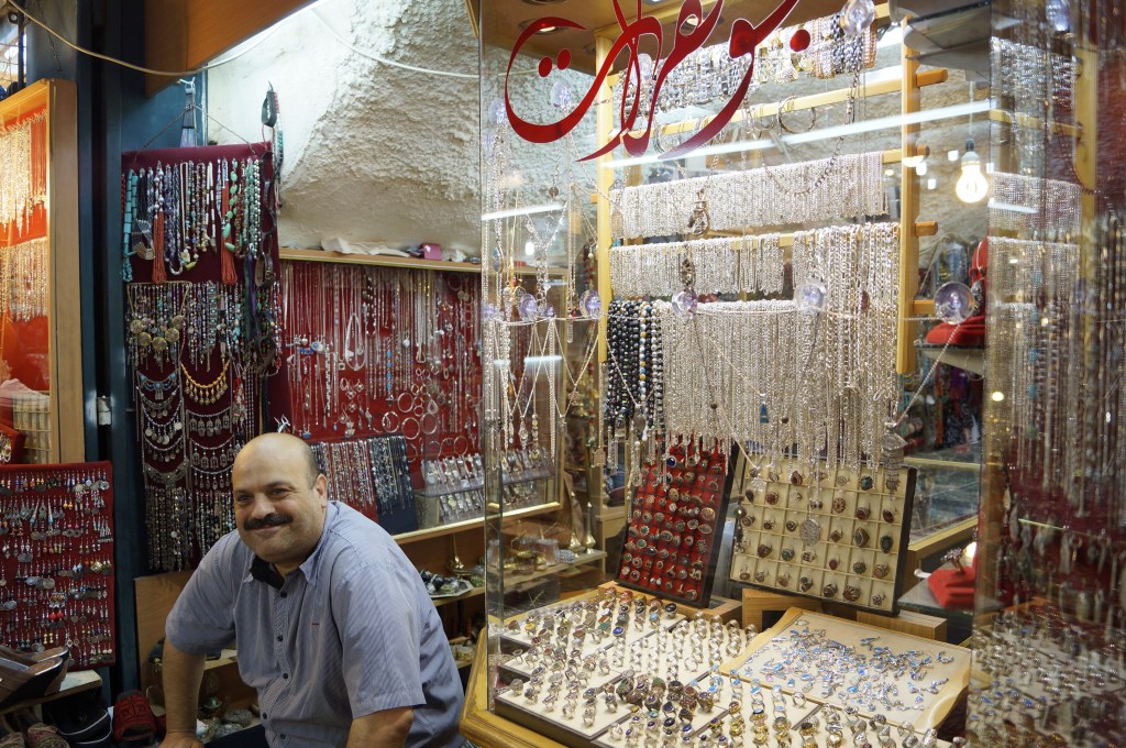 Comerciante palestino em um dos mercados de artesanato e especiairias