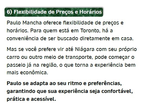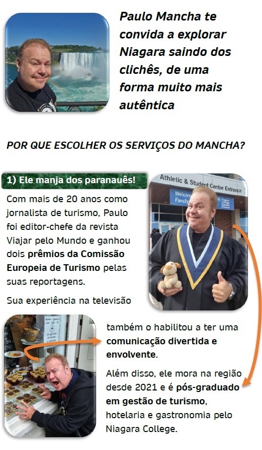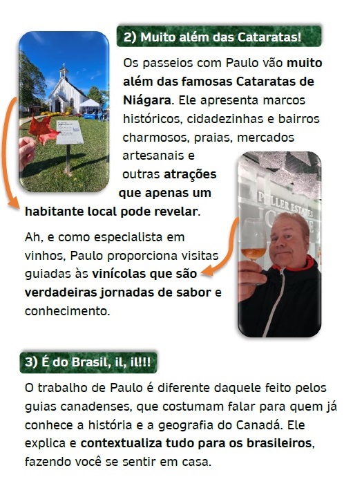 O trabalho de Paulo é diferente daquele feito pelos guias canadenses, que costumam falar para quem já conhece a história e a geografia do Canadá. Ele explica e contextualiza tudo para os brasileiros, fazendo você se sentir em casa enquanto explora tudo o que Niagara tem a oferecer.